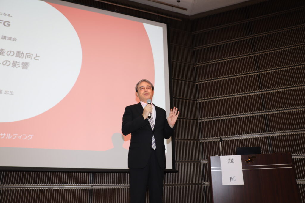 講演会では、「トランプ関税の影響」、「米国経済の動向」、「日本経済への影響」、「トランプ政権の動向」の4つの論点に注目し、米国トランプ政権の関税政策の目的やその個人消費・雇用への影響、日米間の貿易関係やトランプ政権の外交政策について等、多角的な分析に基づき、細尾氏にご解説いただきました。