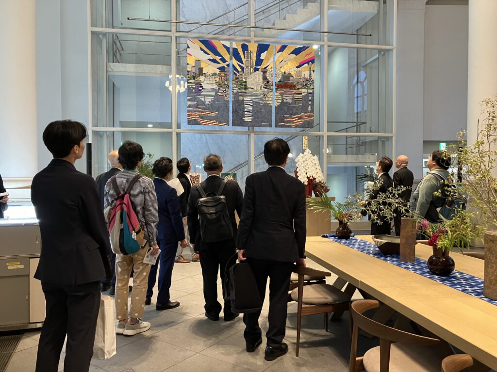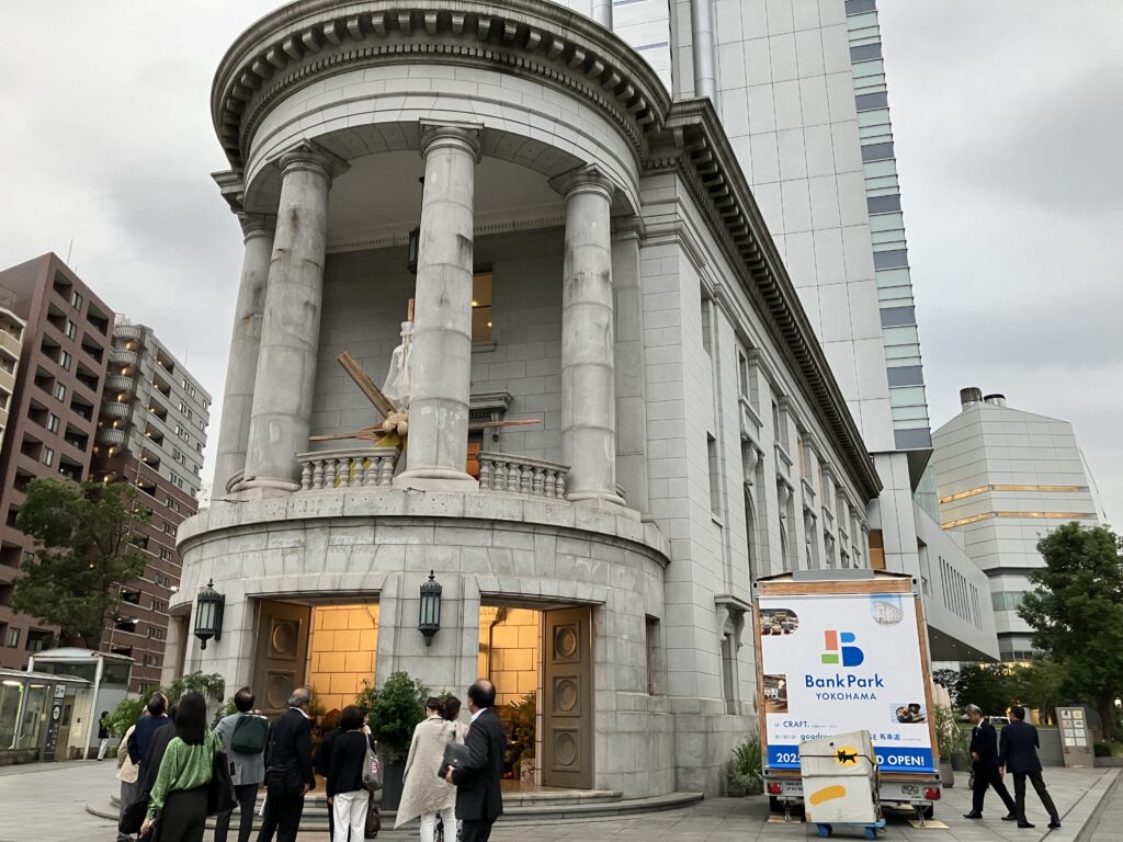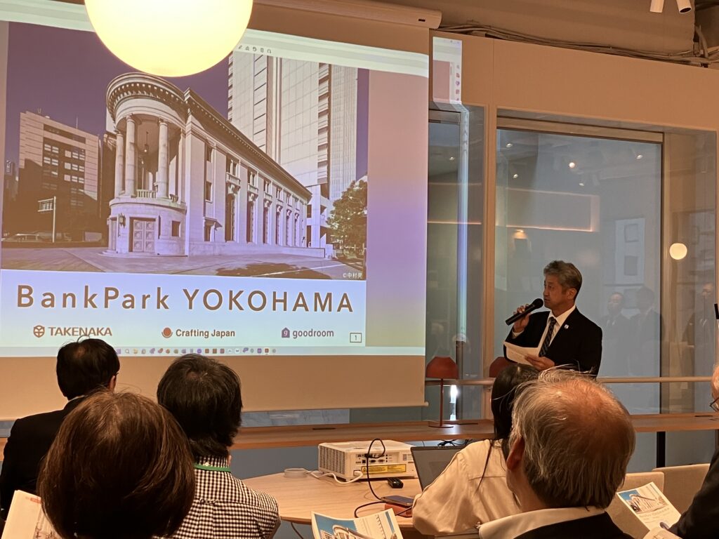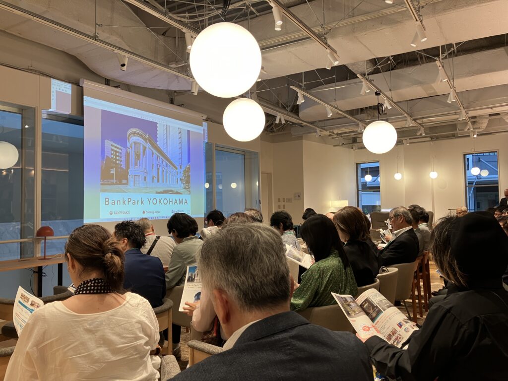 次に、横浜市認定歴史的建造物 旧第一銀行横浜支店を活用したBankPark YOKOHAMAを訪れました。運営事業者の代表事業者である㈱竹中工務店より説明を伺いました。2024年10月4日にリニューアルオープンしたばかりのこの施設は、「街の新たな賑わい」と「ライフスタイルを豊かにする提案」に応える、 「出会い、学び、育つ」公園のような文化交流拠点です。