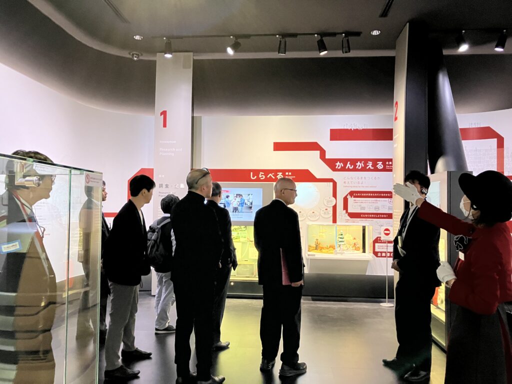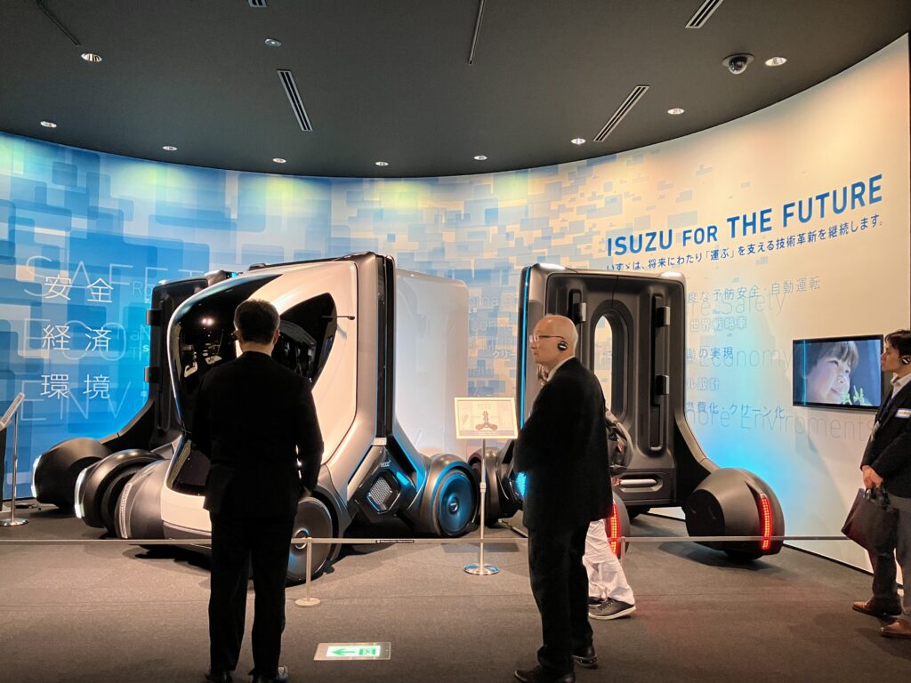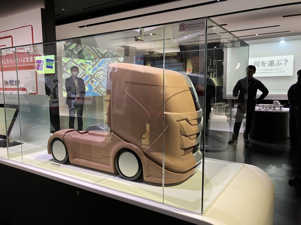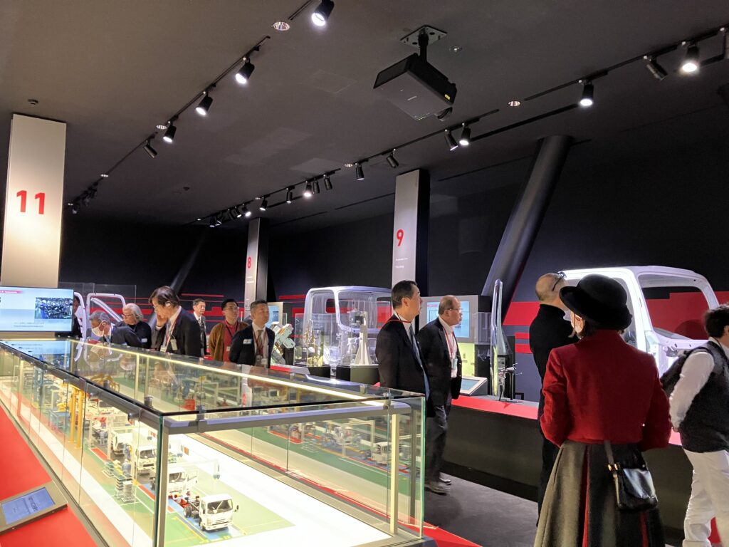 • いすゞのくるまづくり:続いて、トラックが完成するまでの「開発」「生産」「検査」の全工程を紹介する「いすゞのくるまづくり」エリアを視察しました。 開発ゾーンでは、デザイン検討に使用される1/5サイズのクレイモデルを見学し、世界中の過酷な環境を想定した実験や、顧客の声を反映させるデザインのプロセスについて学びました。また、生産ゾーンでは、小型トラック「エルフ」の組立ラインを1/20スケールで再現した精巧なミニチュア模型を鑑賞しつつ、作業員が安全かつ快適に作業するための生産設備の工夫について説明を受けました。参加者は、品質向上や効率化だけでなく、従業員の作業環境改善にも配慮したモノづくりの姿勢から、自社へのヒントを熱心に探っていました。