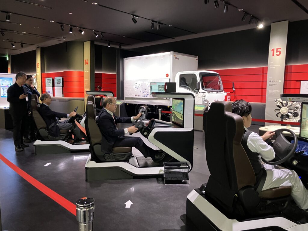 展示車両に乗り込み、ドライバー視点を体験:ガイドツアー後は自由見学の時間を設けました。最新のトラックの運転席に実際に座って視界や居住性を確認したり、安全(Safety)・経済性(Economy)・環境(Environment)の3つの分野で技術の高度化を目指す「See Technology」の展示でサステナビリティへの取り組みを深掘りしたりと、各々が関心のある分野を熱心に視察しました。シミュレーター体験など、童心に帰って楽しめる要素もあり、会場は終始活気に包まれていました。