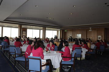 その後、会場をホテルニューグランド「ル・ノルマンディ」へ移し、横浜商工会議所 川本副会頭、小峰副会頭、鷲尾常務理事出席のもと、昼食懇親会が開催されました。川本副会頭による歓迎挨拶の後、七尾女性会 木下特別顧問の挨拶が行われ、河原会長による乾杯発声により、懇親会が始まりました。横浜港が一望できる宴会場にて本格的なフランス料理に舌鼓を打ちながら、各テーブルは終始和やかな雰囲気に包まれた交流会となりました。