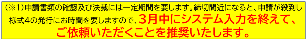 (※1再掲)申請書類の確認及び決裁には一定期間を要します。締切間近になると、申請が殺到し様式4の発行にお時間を要しますので、3月中にシステム入力を終えて、ご依頼いただくことを推奨いたします。