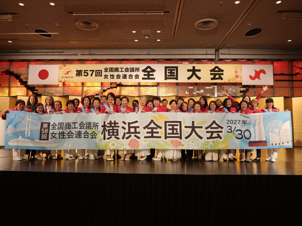 全国大会では、第24回女性起業家大賞の授賞式が執り行われ、当女性会会員である(株)With us 代表取締役の長橋知世会員が栄えある最優秀賞を受賞し、祝福と喜びに包まれました。また、次期開催地となる当所主催の「第58回全国商工会議所女性会連合会 横浜全国大会」のPRも行われ、横浜全国大会実行委員会のメンバーが壇上に上がり横断幕を掲げて大会への参加を呼び掛けました。横浜全国大会の開催日はGREEN×EXPO 2027の会期中でもあり、全国大会と併せて、この機会に是非横浜へ足を運んでいただきたいという思いを、横浜の魅力とともに伝えることが出来ました。そして、大会の締めくくりとして望月会長が女性会旗を受け取り、全国大会開催のバトンが当所女性会へと継承されました。