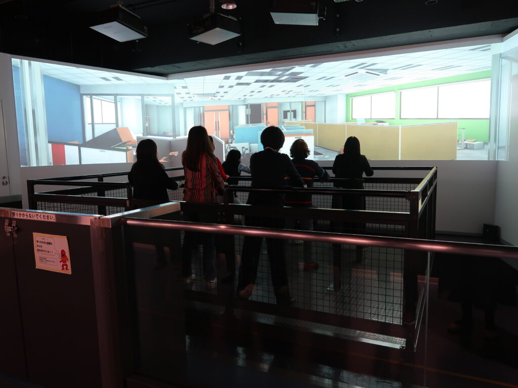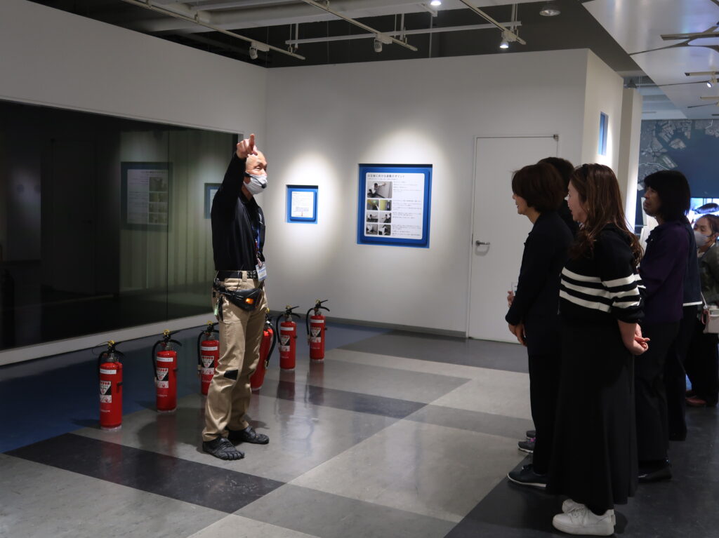 地震・火災体験ツアーでは、まず災害シアターにて横浜で起こりうる災害を臨場感あふれる映像で体験しました。続いて行われた地震シミュレーター体験では、実際に最大震度7の揺れを体感。立っていられない程の揺れに驚くとともに、日常生活で最大震度7の地震が起きた際、自分の自宅や会社など身の回りは安全か、また事前にどのような対策ができるか、考えるきっかけとなりました。さらに地震体験の後は、訓練用消火器を使った消火体験と、煙からの避難行動を体験し、火災からの身の守り方を学びました。最後に減災トレーニングルームという家庭のリビングをイメージした部屋の中で、地震や火災などの災害を疑似体験し、災害から身を守る行動や避難までの流れを実践しました。