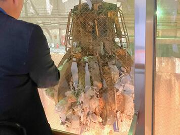 全長5.8mの巨大クレーン等ごみ処理施設を見学後、ごみを燃やした排ガスからCO2を分離・回収する
