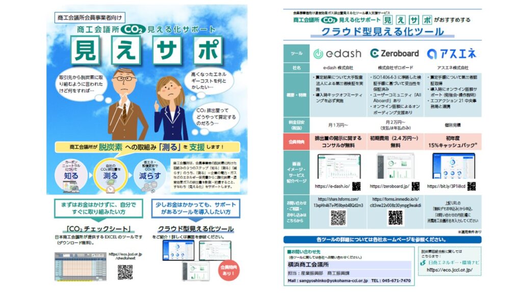 横浜商工会議所では、中小企業の脱炭素・カーボンニュートラルの取組を後押しするため、日本商工会議所、民間事業者3社(アスエネ㈱、e-dash㈱、㈱ゼロボード)との連携のもと、会員企業のCO₂排出量の見える化サービス導入事業「CO₂見える化サポート(『見えサポ』)」を2024年6月25日( 火)より開始しました。