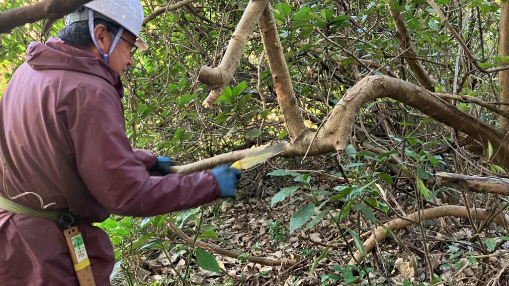 樹木は大きく生い茂っているうえに、つるが絡まっていたため、伐採は容易ではありませんでしたが、懸命な作業の結果、樹木の周辺に奥行1~2mほどの光のあたる空間を確保することができました。