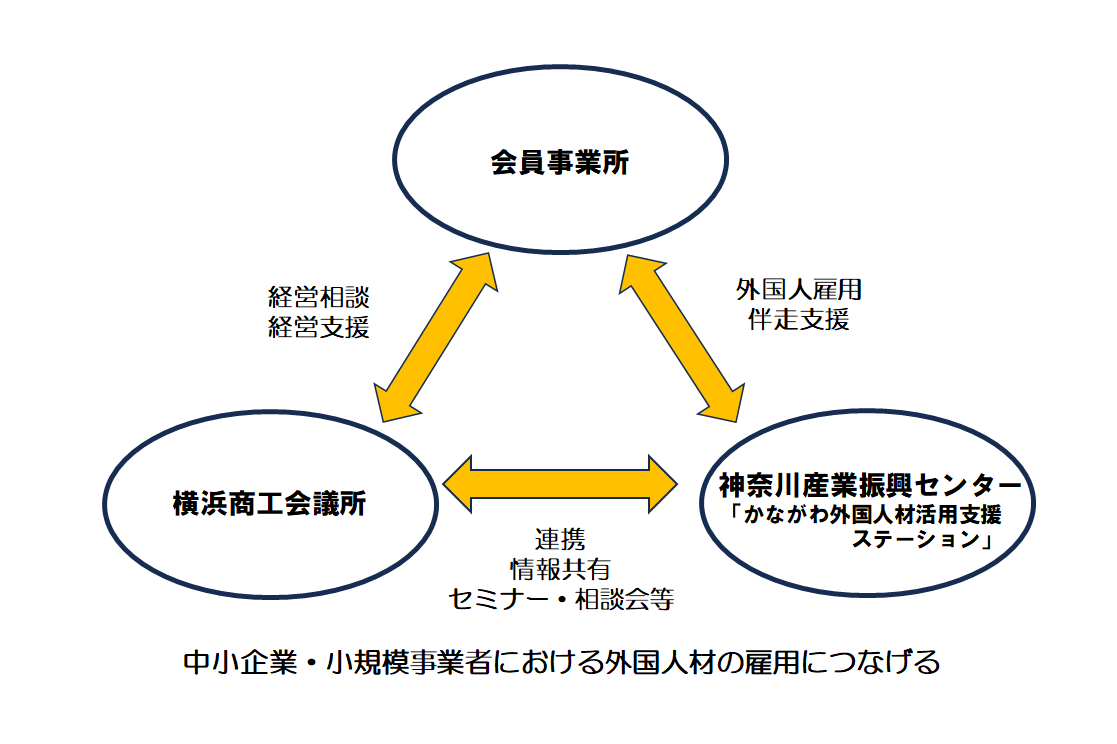横浜商工会議所では、人手不足に対応した人材採用支援活動の一環として、公益財団法人神奈川振興センター(KIP)と連携し、KIPの運営する「かながわ外国人材活用支援ステーション」により、中小企業・小規模事業者等への外国人材雇用の支援をいたします。
