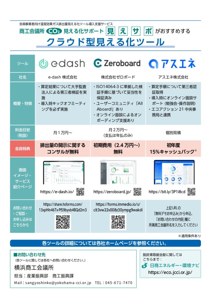中小企業向けのCO₂排出量見える化ツールの提供で実績を有する民間事業者3社(アスエネ㈱、e-dash㈱、㈱ゼロボード)との連携により、会員事業者の排出量見える化クラウド型ツール導入を支援します。